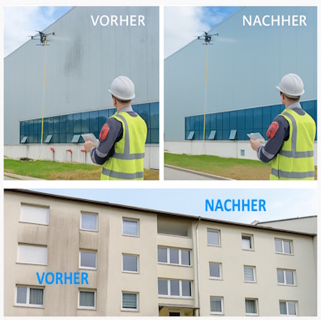 Mit unserer Hochdruck-Drohnenreinigung wurde diese stark verschmutzte Aluminiumfassade in 50 m Höhe effizient und schonend gereinigt – ohne Gerüst oder Hebebühne. Das Ergebnis: gleichmäßig saubere Oberfläche ohne Rückstände, in kurzer Zeit und mit minimalem Personaleinsatz. 👉 Ideal für großflächige Gebäude, Hochhäuser und schwer zugängliche Fassadenbereiche.